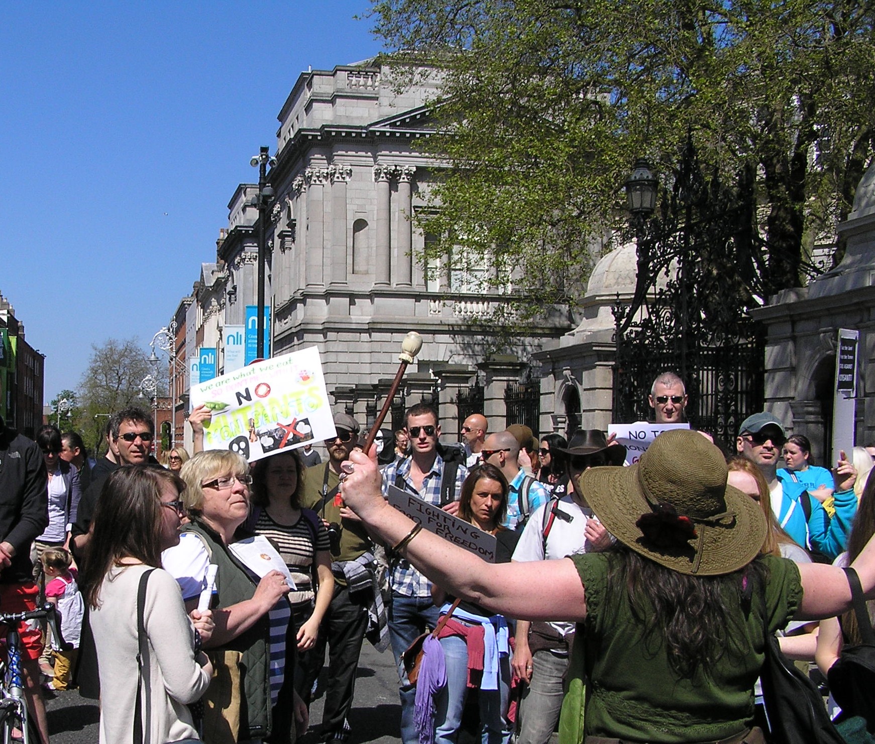 From there the march wound its way up past Trinity then up to Kildare Street and stopped outside the Dail for a few minutes before finally arriving on the square beside the Dept of Agriculture on Kildare Street, where a brief speech was given by one of the organisers outlining the dangers of GM crops and how these are a danger to our health and environment, how the safety has not at all being established. He also pointed out that much of the GM food we eat is actually in the form of meat since much of it goes in the form of animal feed where it does not have to be labelled at that point. He encouraged people to contact their local supermarkets and restaurants and food outlets that they visit and ask them whether they use GM ingredients
