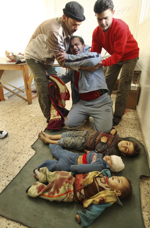 The dead and injured - including nine children, four women and six men - were sleeping when the first shell hit at around 6am local time. Many of the victims were taken to hospital in their pyjamas