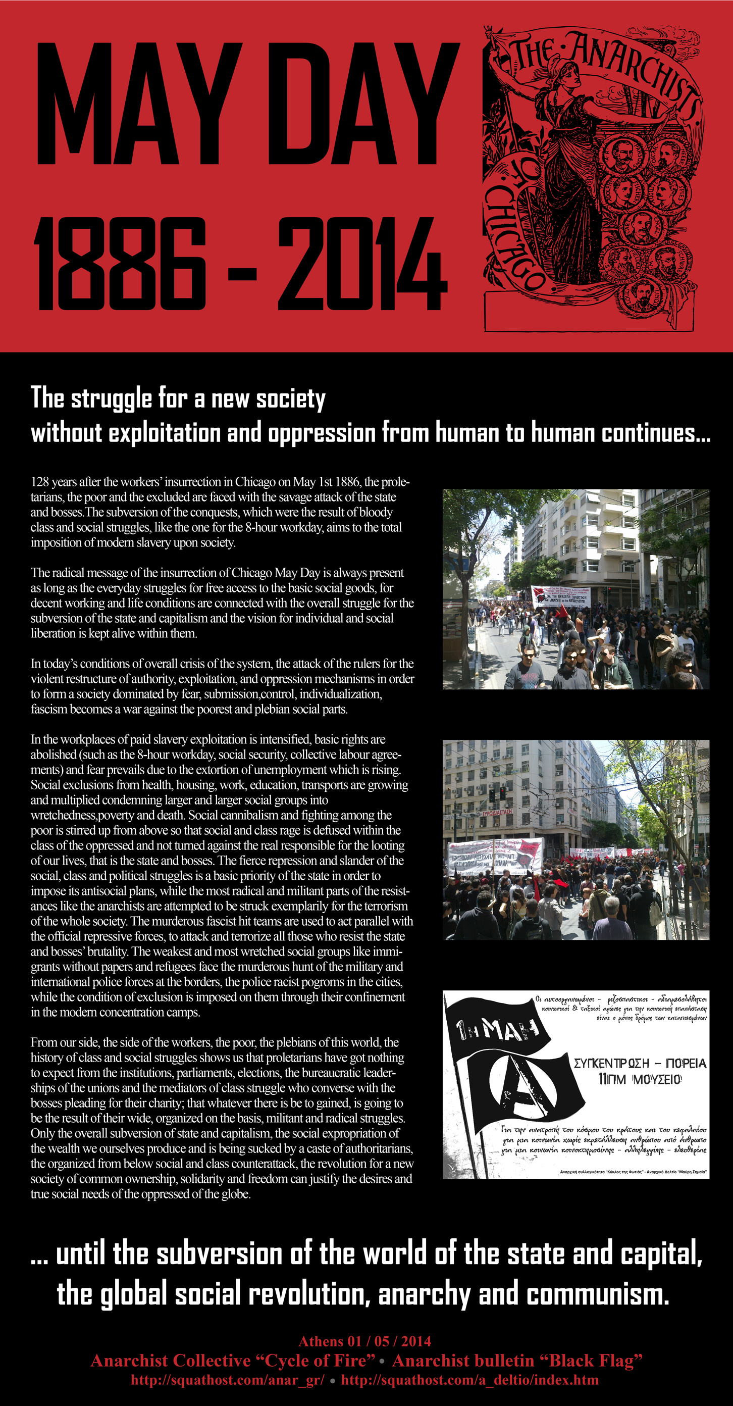 The radical message of the insurrection of Chicago May Day is always present as long as the everyday struggles for free access to the basic social goods, for decent working and life conditions are connected with the overall struggle for the subversion of the state and capitalism and the vision for individual and social liberation is kept alive within them.