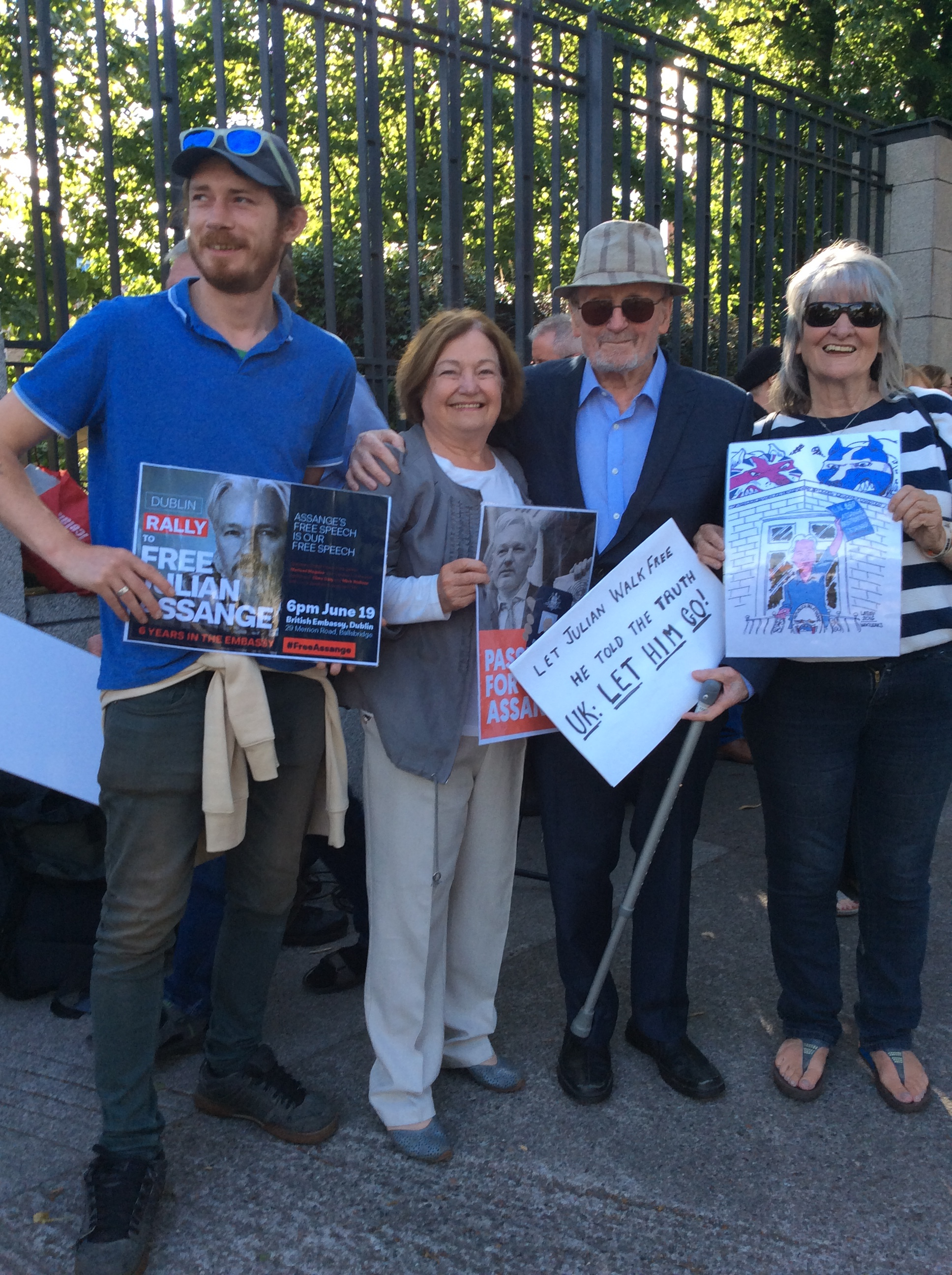 The theme was captured in the chant: "All we are saying is FREE JULIAN ASSANGE" that rang out loud and clear over and over in the evening summer sun. It was Mairead who had contrasted our sunny outing in Dublin with the pitiless conditions of confinement obtaining in the embassy where Julian is now a de facto prisoner with no access to fresh air for the past six years.