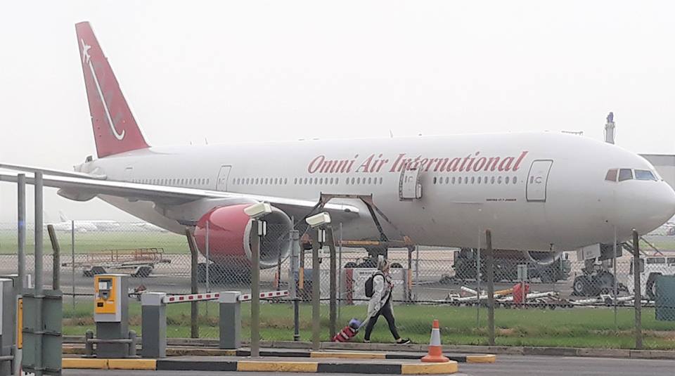 One was a large C17 Globemaster hiding in the fog, number 03-3124. This warplane has since flown on the USA, and is now heading south possibly towards Florida. The other was Omni Air N819AX on contract to the US military. It arrived from Norfolk Naval Station Chambers field in USA on Sat 20 April and flew on to Kuwait.