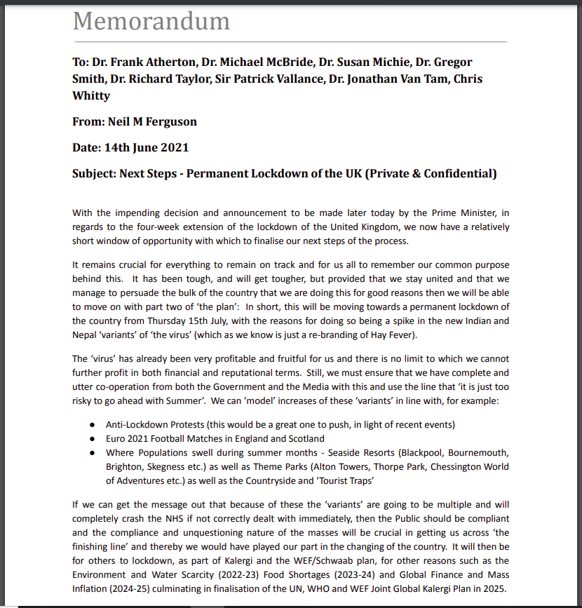 An apparent secret memo from Neil Ferguson to the UK SAGE group appears to lay out a plan for permanent lockdowns and is indeed very sinister. It is so f**king evil one would automatically think it has to be fake and lets hope it is. However if any of what is said in the memo comes to pass then we know the plan has merit. Judge for yourself but keep it in mind in the months ahead.