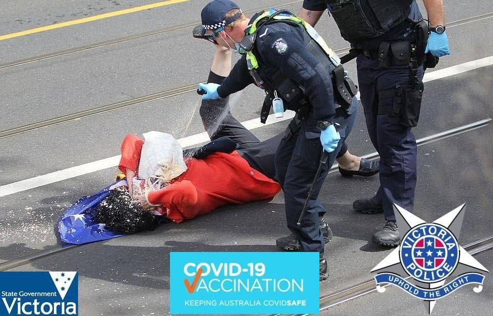 We have got to remember that all these restrictions by government are because they care about us and they want to keep us all safe. And so we can see the Australian police are taking their job over there very seriously by attacking a 70 year old woman on the street by pepper spraying her in the face while she lay defenseless on the ground after been shoved there by the same guardians of not just peace but health too.