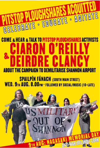 Two of the five anti-war activists recently acquitted in the Dublin Four Courts for their decommissioning of a US warplane at Shannon airport will speak in Cork on Wednesday, 9th August.
