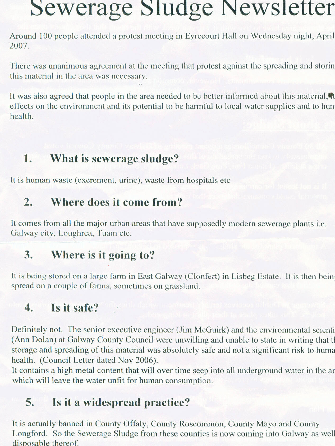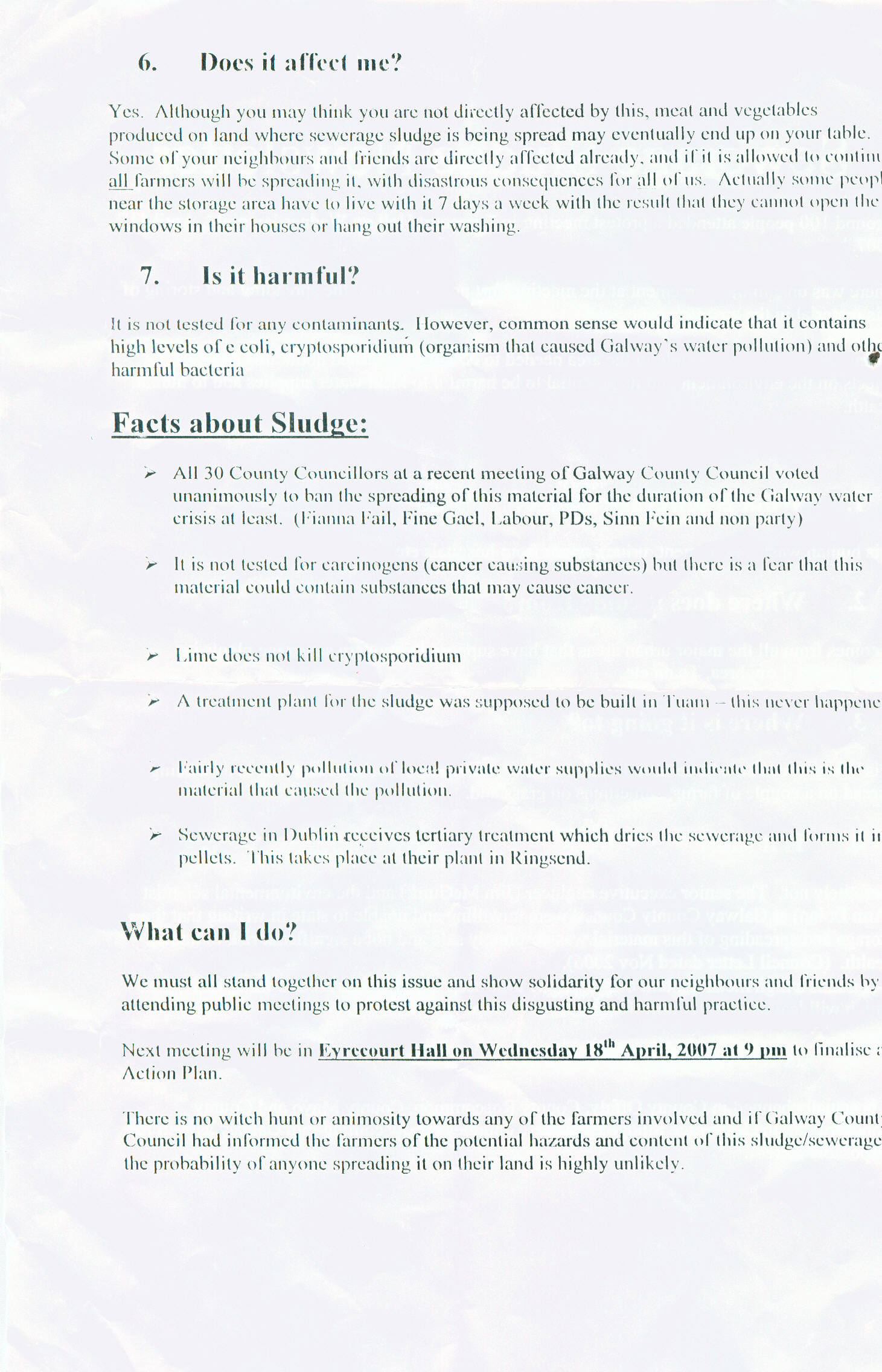 A meeting will be held in Eyrecourt, Go. Galway, Town Hall, Wednesday 18th April, 2007 at 9 PM to discuss an action plan against the spreading of human waste (urine and faeces) on farms in Galway.