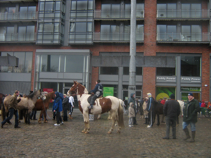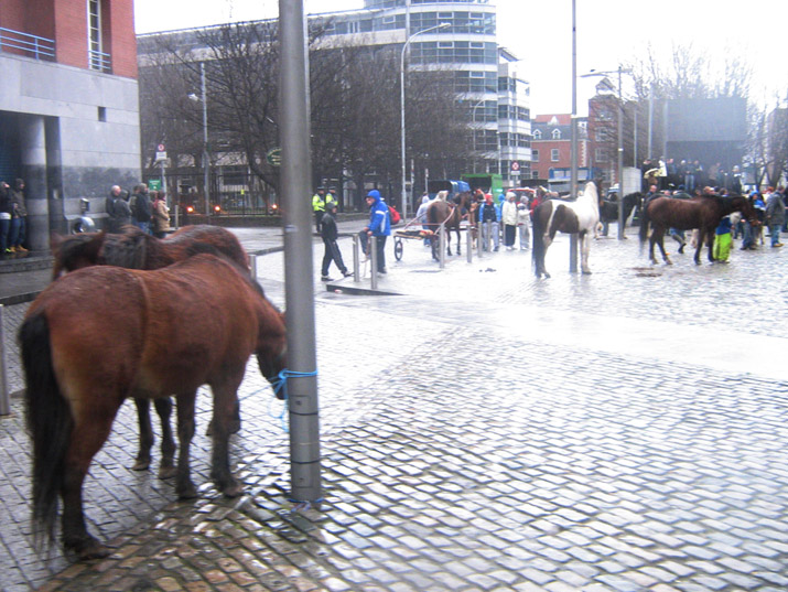 Another way of looking at is that Smithfield is where a lot of soon-to-be abandoned horses find new homes. During the boom years horse-ownership , jodpurs and riding lessons for the kids became important status symbols for a lot of high earners in this country . With the onset of the recession many horse-owning middle class households found themselves unable to pay high stabling costs and started dumping their horses .The luckier ones ended up at Smithfield .