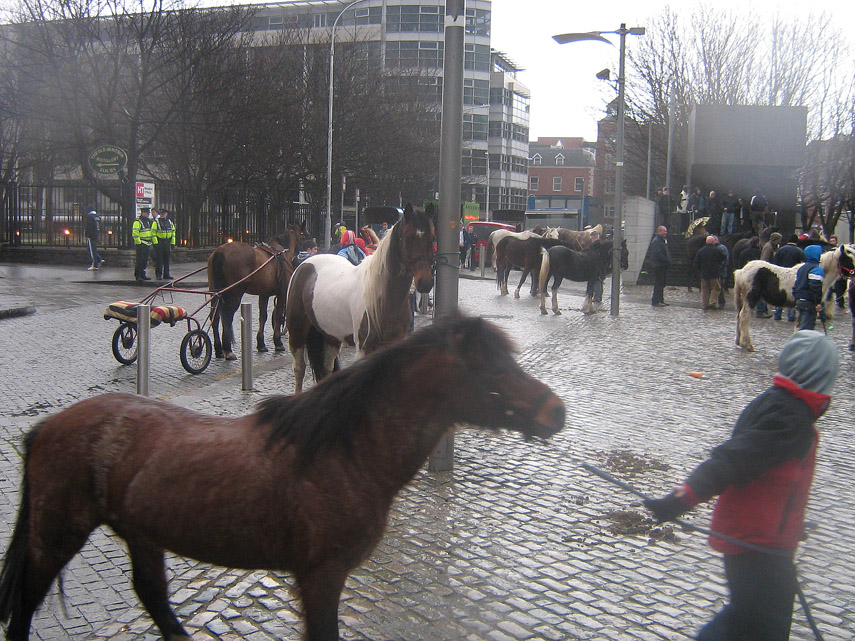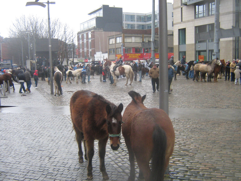The regular horse fair, held just after dawn on the first Sunday in every month, has been going on since at least the latter half of the nineteenth century. Dublin Corporation never had anything to do with the horse fair, but in the 1990's the City Council tried to involve itself in supervision of the fair, and encouraged the Gardaí and the DSPCA to monitor activities there. A few years ago, the Council gave up trying to run the fair, since some local residents, business owners and developers who have moved into the area, were making a lot of complaints about it.