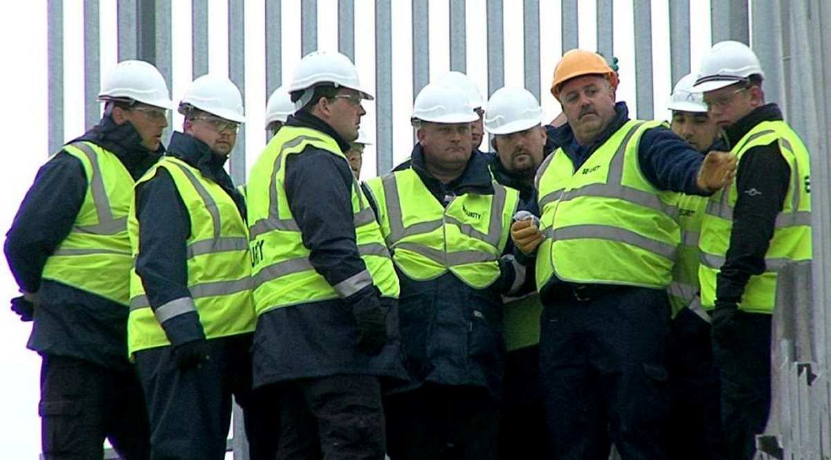 Michael Dwyer (second from left) with IRMS boss Jim Farrell (yellow hat) at Shell's pipeline works in Glengad, County Mayo